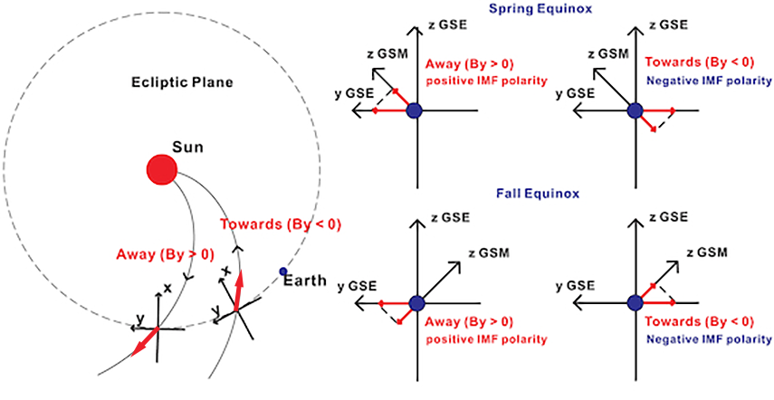 The drawings on the right of the figure illustrate how the axis conversion converts By into Bz around the equinoxes when the By component is positive and negative.